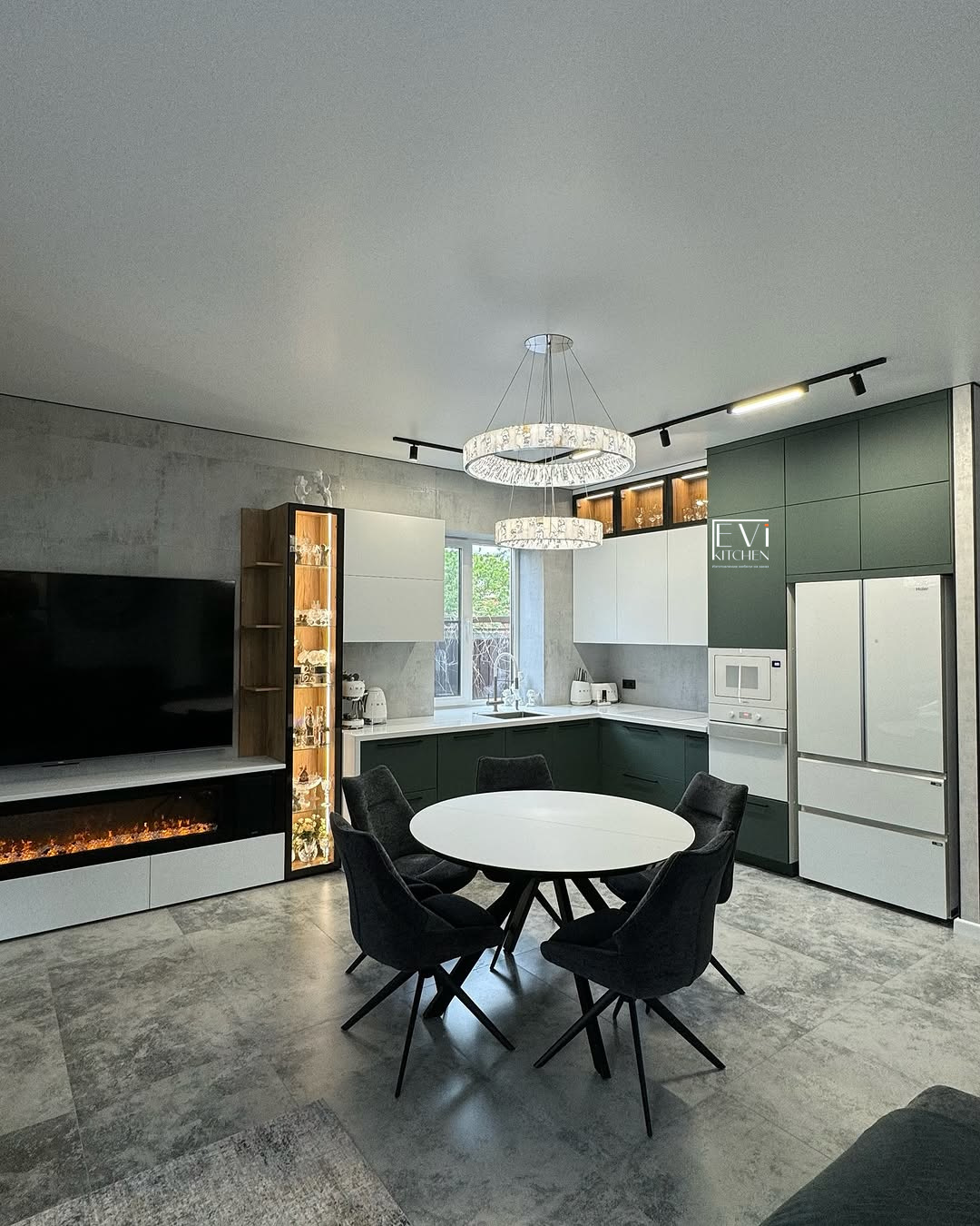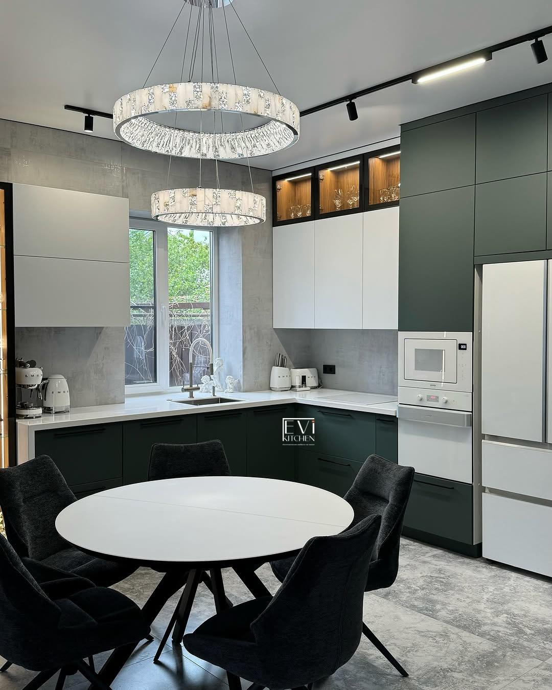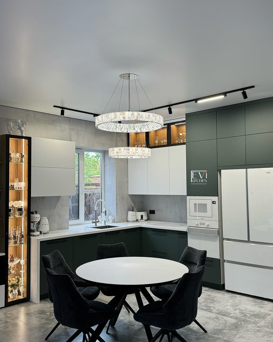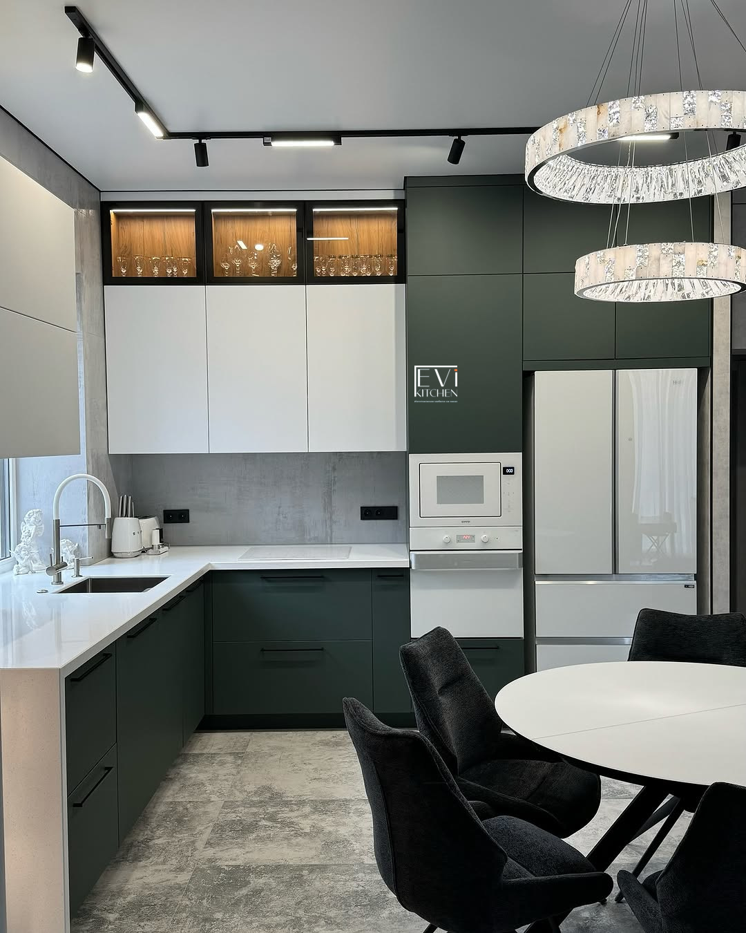 Фурнитура Boyard EVO и скрытые выкатные механизмы обеспечивают плавную работу. Кухня дополнена чёрной стальной мойкой, смесителем и подсветкой витрины для атмосферного акцента.